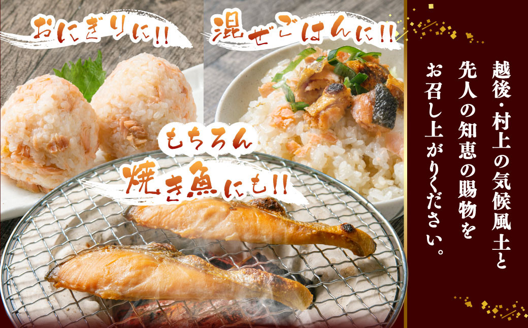 伝統の製法と弊店こだわりの製法で国内産の脂の乗った秋鮭を塩引加工し、村上特有の寒風で仕上げました。 1尾を3切ずつの真空パックにして中骨と頭もお付けします。 【地場産品に該当する理由】 市外から原材料を調達し、市内の職人によって選別・仕込み(下処理、塩のすり込み)・発酵・熟成・切り分け・包装までの一連の工程を行っており、相応の付加価値が生じているものです。(告示第5条第3号に該当)