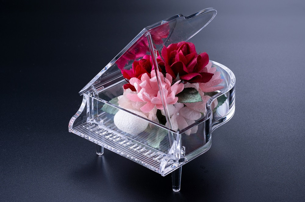 【まゆ玉から生まれる花 まゆ花(別名:シルクフラワー)】 まゆ花と透明感のあるアクリルピアノのアレンジ B4123