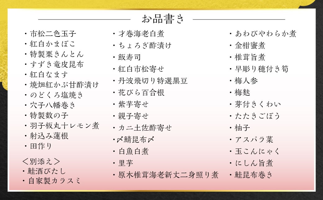 | 容量 | 全40品 2人前/一段のサイズ(約:cm)縦21×横21×高さ5 【同梱物】お品書き【重箱の材質】木製 市松二色玉子/紅白かまぼこ/特製栗きんとん/すずき竜皮昆布/紅白なます/焼畑紅かぶ甘酢漬け/のどくろ塩焼き/穴子八幡巻き/特製数の子/羽子板丸十レモン煮/射込み蓮根/田作り/才巻海老白煮/ちょろぎ酢漬け/飯寿司/紅白市松寄せ/丹波飛切り特選黒豆/花びら百合根/紫芋寄せ/親子寄せ/カニ土佐酢寄せ/〆鯖昆布〆/白魚白煮/里芋/原木椎茸海老新丈二身照り煮/あわび柔らか煮/金柑蜜煮/椎茸旨煮/早彫り穂付き筍/梅人参/梅麩/芽付きくわい/たたきごぼう/柚子/アスパラ菜/玉こんにゃく/にしん旨煮/鮭昆布巻き <別添え>・鮭酒びたし/自家製カラスミ |