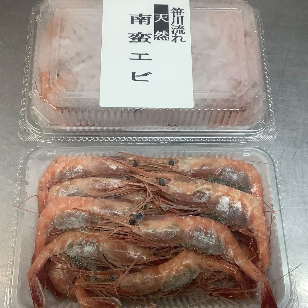 村上市山北沖で獲れた新鮮な南蛮エビ。お刺身や頭は、味噌汁にお使いください。