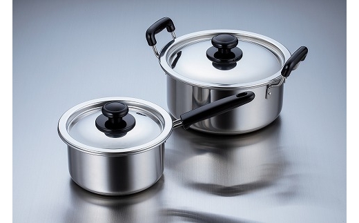 サビに強いステンレス製の24cm両手鍋と18cm片手鍋のセットとなります。 煮物やカレーなどの煮込み料理をはじめとして、食材の下ごしらえなど幅広いシーンで役立ち、ガス火はもちろんIH調理器にも対応しています。 材質には耐久性・耐腐食性に優れたモリブデンステンレスを使用し、使い込んでも劣化しにくく末永くお使いいただけます。 ものづくりの街として歴史ある燕市で職人が1つ1つ手作業で加工しており、丁寧に磨き上げられたステンレスが美しく輝きます。 〈製品仕様〉 ・両手厚板実用鍋24cm 容量:5300ml 材質:本体・蓋=モリブデンテンレス鋼、ハンドル・ツマミ=フェノール樹脂 仕上げ:ミラー仕上げ 寸法:内寸240mm、深さ120mm 重量:1630g 食器洗浄機:非対応 IH対応:100V・200V対応 ・片手鍋18cm 容量:2200ml 材質:本体・蓋=モリブデンテンレス鋼、ハンドル・ツマミ=フェノール樹脂 仕上げ:ミラー仕上げ 寸法:内寸180mm、深さ105mm 重量:740g 食器洗浄機:非対応 IH対応:100V・200V対応 ※空焚きは変形・変色の原因となりますので行わないでください。