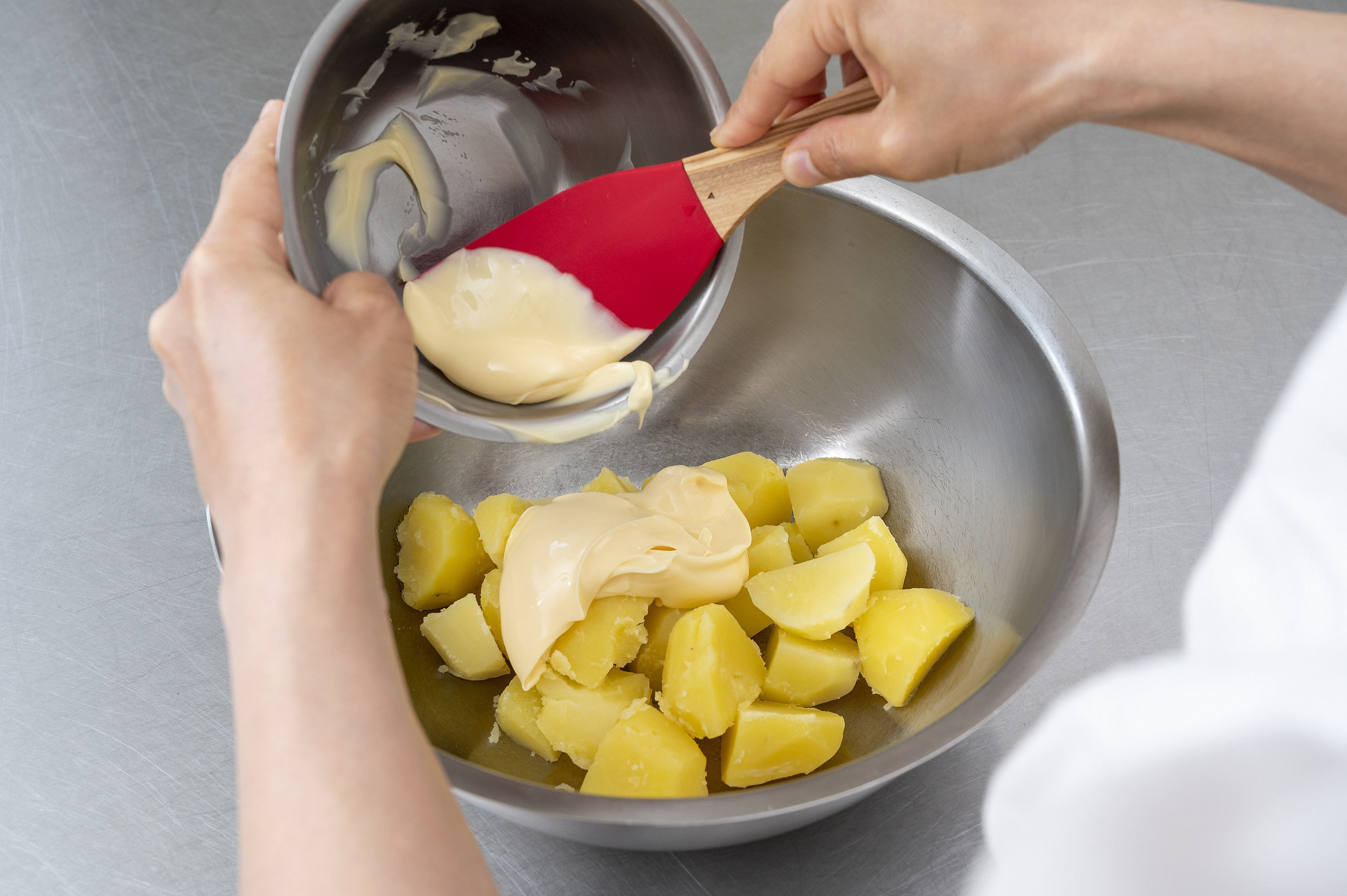 シリコーンヘラはボールやフライパンにフィットするなめらかなカーブと容器の角までしっかり取れる90度の先端形状。