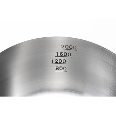 両手鍋は安定した底の形状が特徴です。蓋は転がりにくいつまみ形状です。行平鍋には内側に目盛り(800・1200・1600・2000ml)がついています。