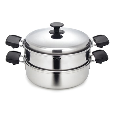 新潟県燕市の職人がお届けする直径24cmの二段蒸し器です。鍋は熱伝導に優れた軟鉄を耐久性のある18-10ステンレスで挟んだ三層鋼材を使用しています。蒸し料理だけでなく、卓上鍋としても御使用頂けます。ガス火・IHクッキングヒーター(100V・200V)で使用可能です。