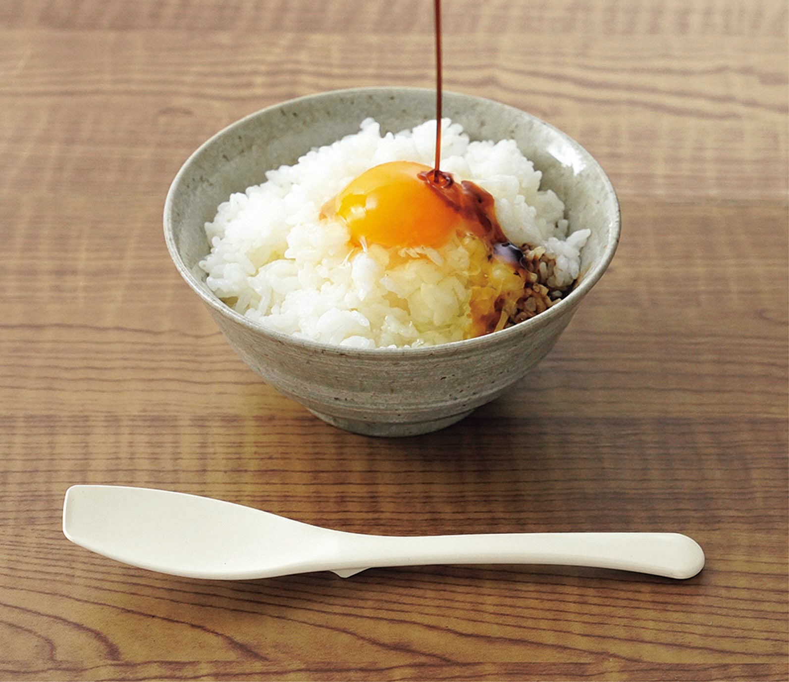 お米由来のバイオマスプラスチックを使用したしゃもじとスプーン。