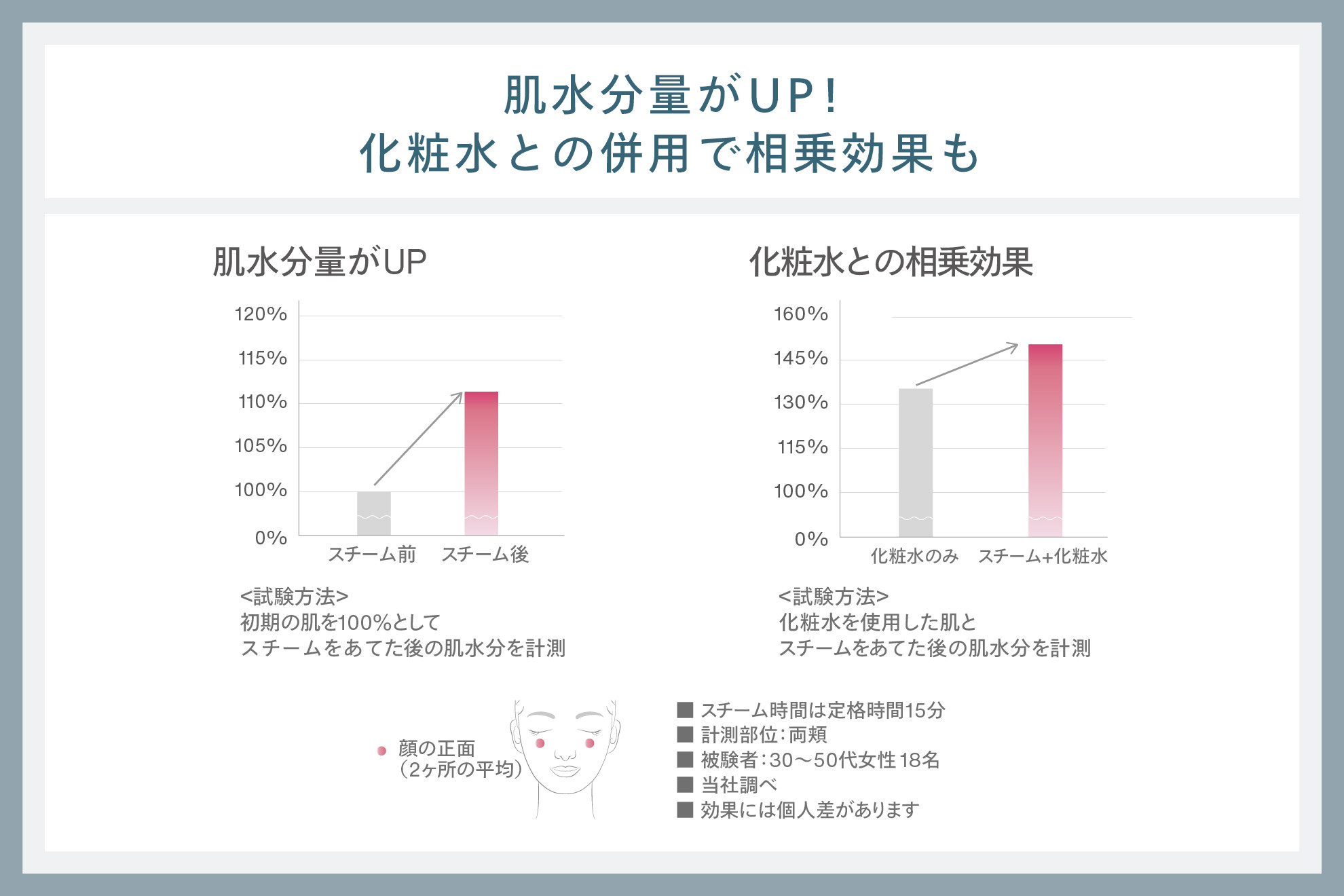 イオン化された微細スチームが肌の角質層までしっかりなじみます。ダブルスチームが顔全体を包み込み、うるおいを与えます。またノズルが可動式なので、胸元から額までらくな姿勢で広範囲をケアできます。
