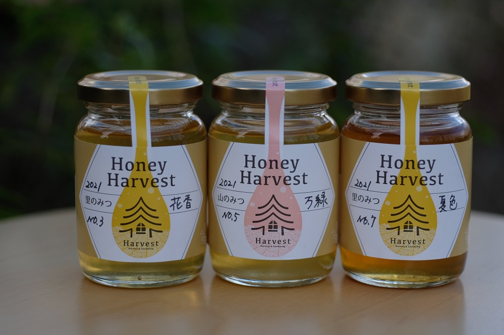 「里のみつ(燕市で採れたハーブや花の蜜)」「山のみつ(燕市のお隣 弥彦村で採れた山間の蜜)」から、その季節に採れた3種類を箱に入れてお届けします。