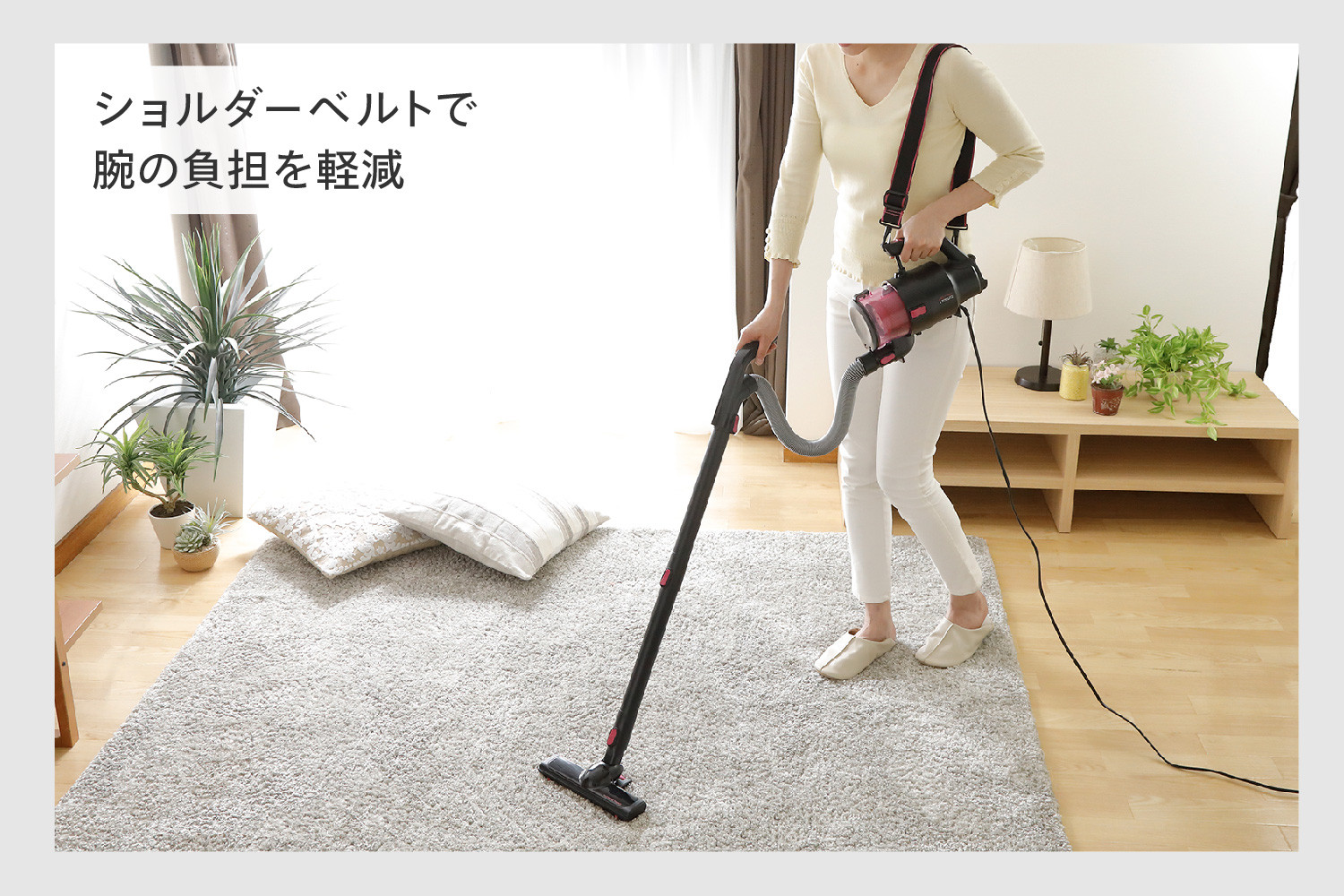 さらに、ショルダーベルトと伸縮ホースを付ければ持ち手の負担も減り、小回りがきいてらくらく掃除できます。