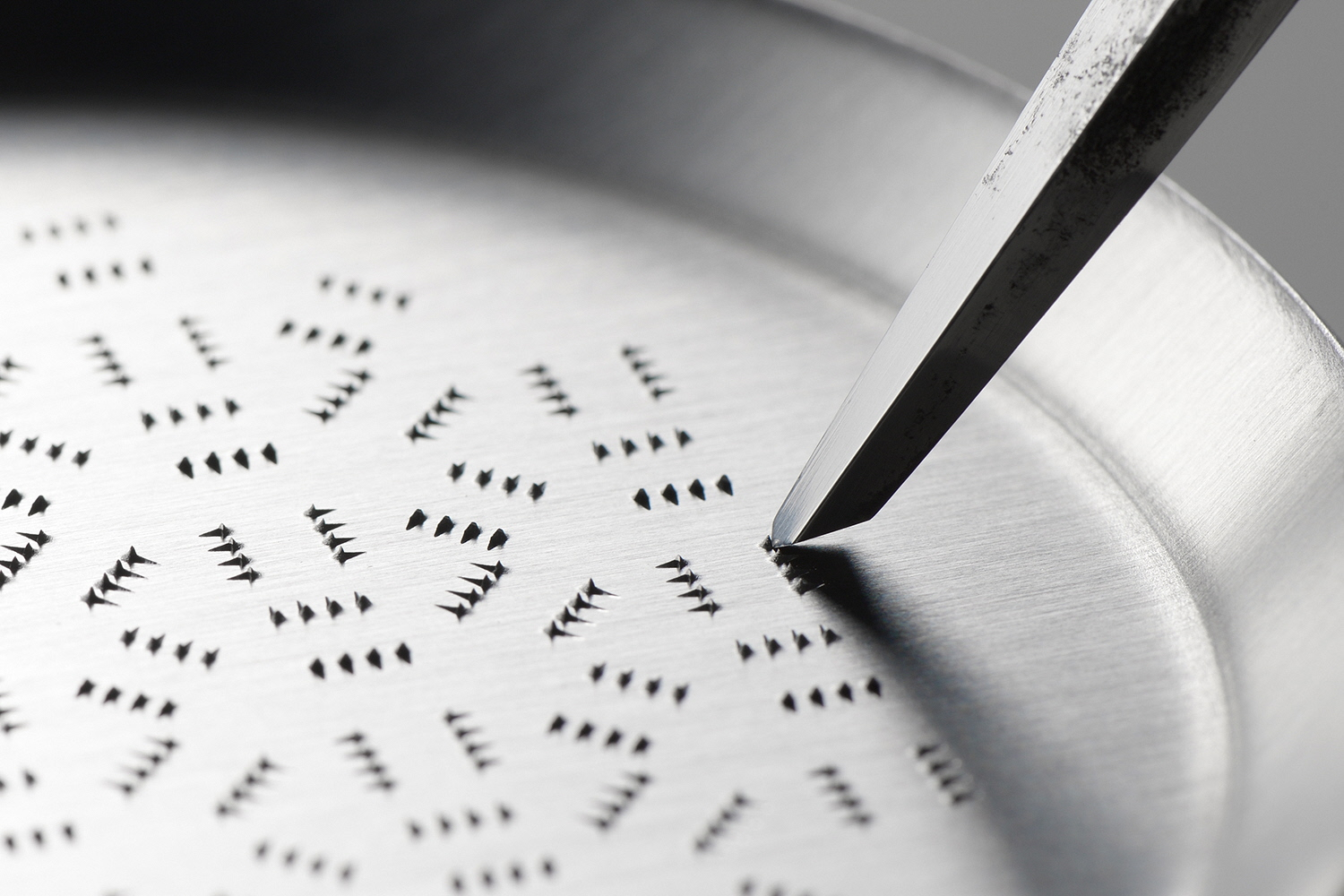 わさび専用のおろし金。タガネで一目ずつ丁寧に掘り起こした本目立てと独自開発の8方向から構成される“デュアルクワトロ極細刃”により、クリーミーな口どけ食感。