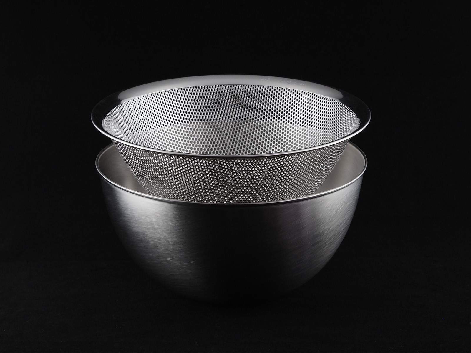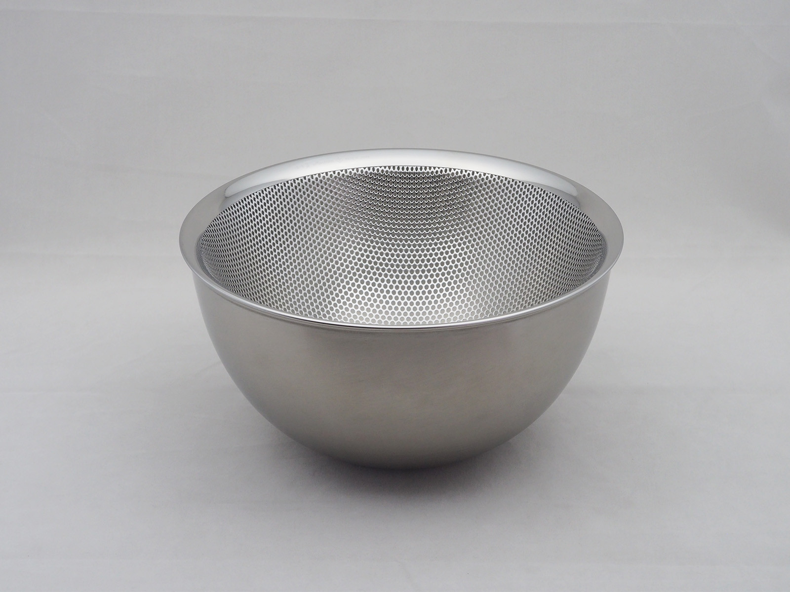 ボウルは料理の専門家や多くの主婦の意見に基づき、用途に合わせた使い勝手の良いサイズや形状にデザインされました。 パンチングストレーナーは、接地面の少ない断面形状で、水切りの良い設計になっています。ステンレスボウルと組み合わせて使えるようにサイズを設定してあります。素材は、18-8ステンレス板にパンチング加工を施し成型されており、日詰まりしにくく洗いやすいので清潔に使用でき、また網のように破れず丈夫なので長くお使いいただけます。