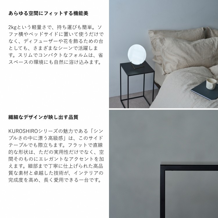 細く無駄のないシンプルなデザインを追求したサイドテーブル。 無彩色だからこそ、質感・デティールにこだわりました。 ソファ横やベット横に置くサイドテーブルとして、観葉植物を飾るフラワースタンドとして、 マルチにつかえるサイドテーブルです。 組立不要の完成品でお届けいたしますので、届いてすぐにご使用いただけます。 プレゼントにもおすすめです。