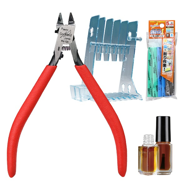 ①ブレードワンニッパー プラモデル用「片刃ニッパー」のスタンダードモデル! アルティメットニッパーと同じ使い方ができる片刃構造 切刃を長持ちする刃角度に設計、丈夫さと扱いやすさを備えています。 透明プラスチックの切断がアルティメットニッパーはΦ1mmまでなのに対し、ブレードワンニッパーはΦ2mmまで対応。 切り心地はアルティメットニッパーよりわずかに重く感じられますが、スライスカットした際の切断面はほぼ違いがありません。 ②ニッパースタンド 収納の悩みを解決!作業スペース確保で製作効率UP! ニッパー・プライヤー・小物類を安全に収納! 作業中に乱雑になりがちなニッパー等の工具を最大で5丁、下部にはピンバイスやナイフ等転がりやすい工具を最大7丁まで安全に収納可能。 作業スペースを整理して、製作効率をアップすることができます。 ③神ヤス! 5mm厚 3種類 Bセット 切削力長続き!高耐久スポンジヤスリ! 表面仕上げに便利な600番、800番、1000番をセット 紙ヤスリと違い、布ヤスリは曲面、平面の整面、処理など様々な場面で使える汎用性を持っています。 スポンジ面にはひと目で番手がわかるプリントを採用。 空研ぎ・水研ぎ対応、プリント部には滲みづらいインクを採用し安心して作業が可能です。 ④ニッパー専用メンテナンス油セット 表面の錆、軸のガタツキ防止に!愛用のニッパーを長く使いたい方に! ニッパー表面に塗ることで錆を防止する専用メンテナンス油セット。 1液で防錆、潤滑まで対応可能なオリジナルブレンド。 表面には強固な膜による錆止め効果、可動部への注油で軸の摩耗を抑えガタツキを防止します。 メンテナンスに必要な拭き取り用ウェス(キムタオル)2枚と切断時の切りくずを落とす刃ブラシが付属。