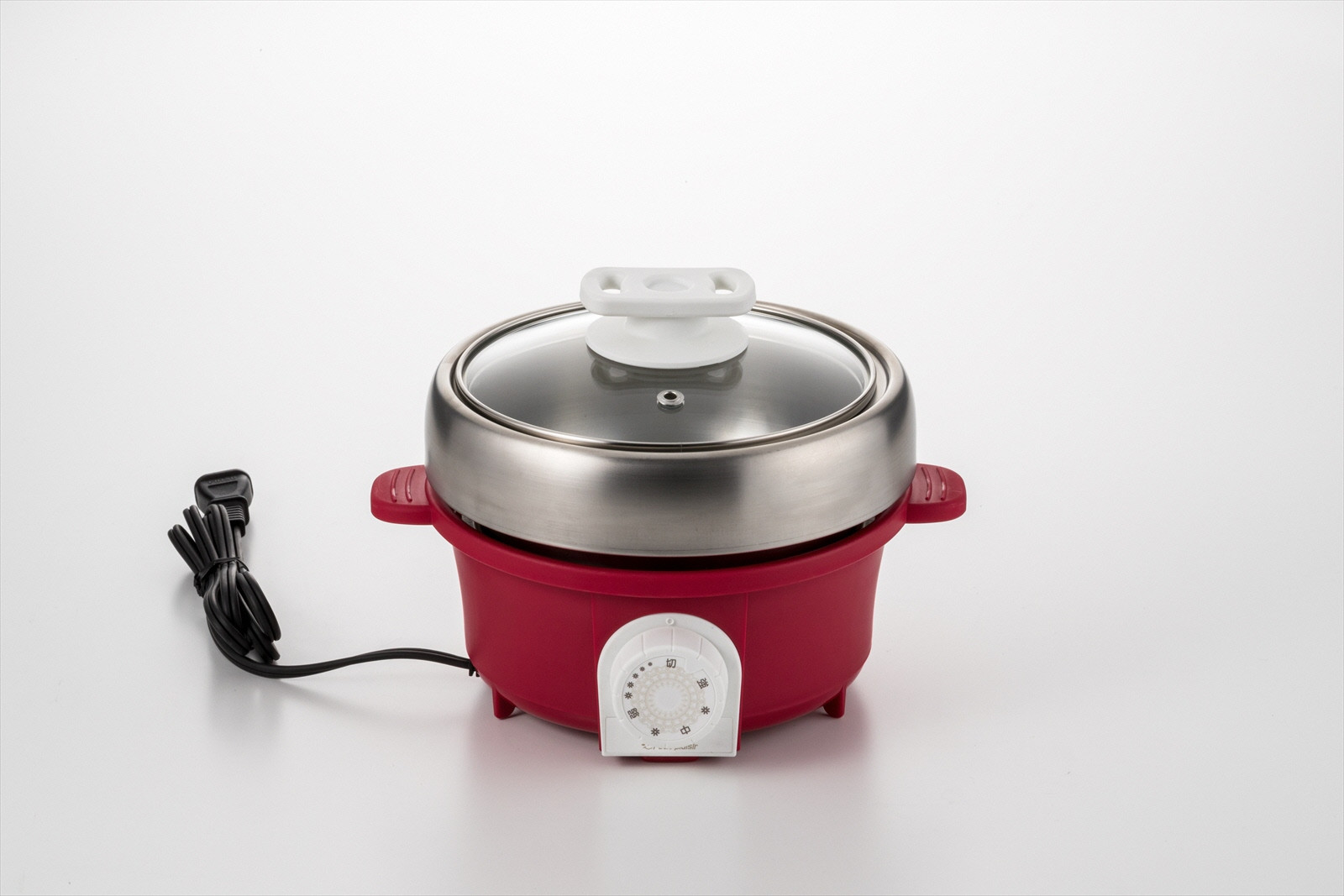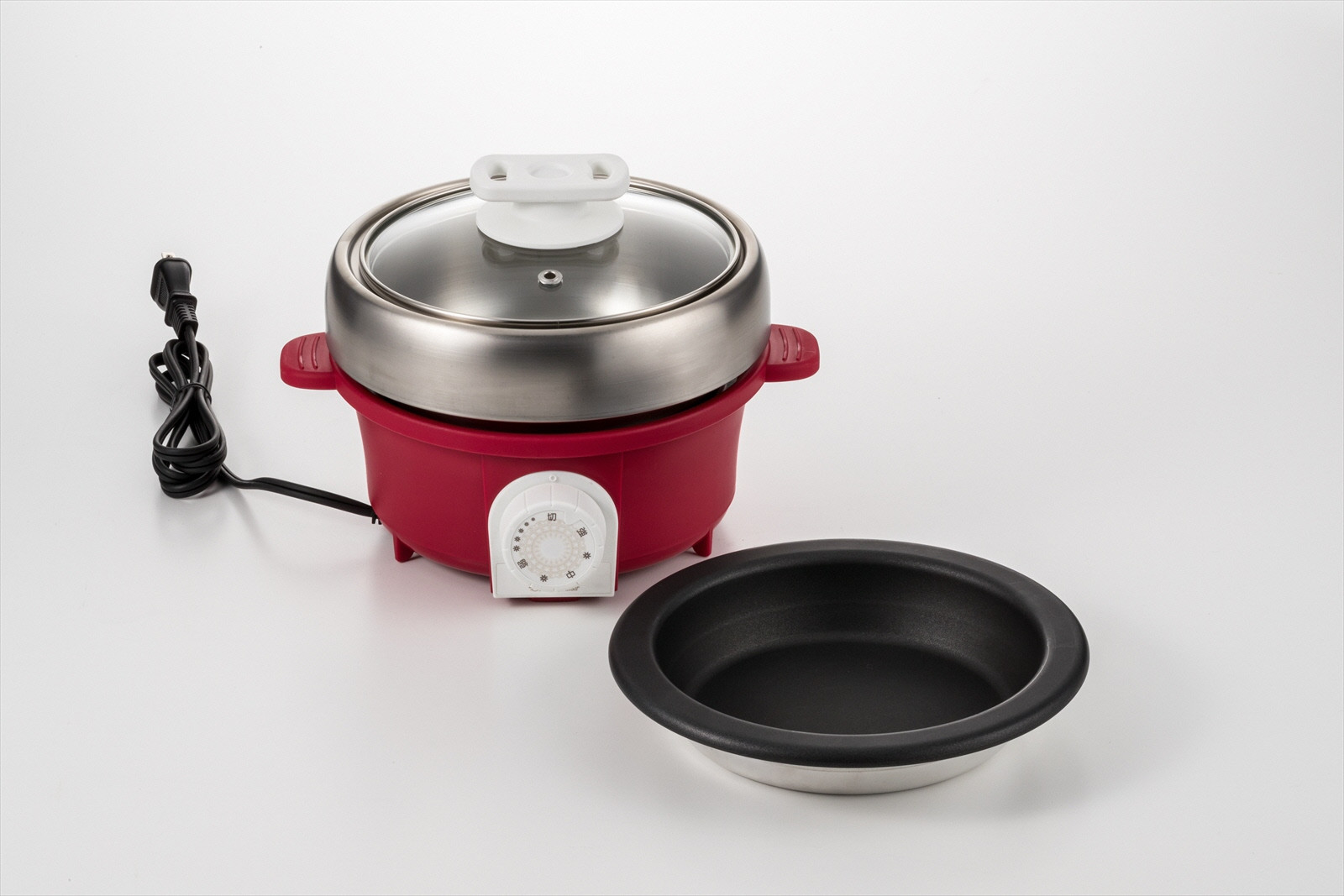 | 容量 | 材質:深型プレート=18-8ステンレス、本体枠・ツマミ=ポリプロピレン、蓋=強化ガラス、グリルプレート=アルミニウム合金(フッ素樹脂加工) 寸法:幅24×奥行21×高さ17cm(深型プレート取付時) 深型プレートのみφ16×7cm(満水容量1.3L) グリルプレートのみφ16×深さ3.5cm 重量:1.4kg |