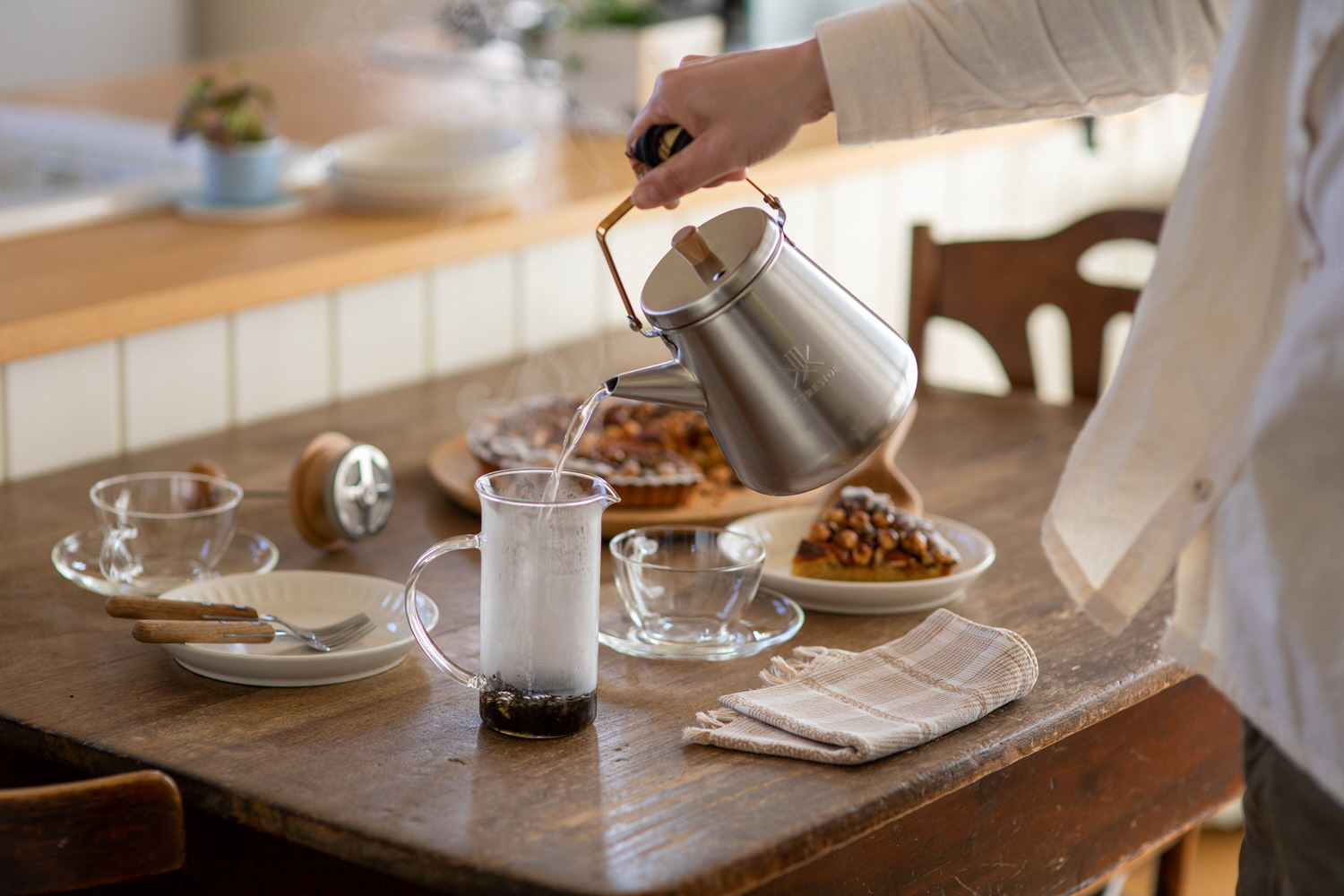 寒い冬、薪ストーブで湯気を上げる小さなケトルは、ストーブを起点に季節を変え場所を変え、ある時は野で山で、人の傍らに寄り添う「旅するケトル」になります。