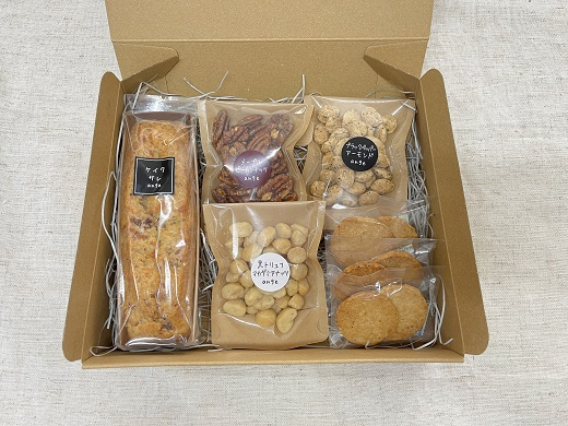 | 容量 | ・塩味のパウンドケーキ ・ナッツ3種類(アーモンド、マカダミアナッツ、ピーカンナッツ) ・チーズ味クッキー 箱:W240xH60XD195 重量:約470g |