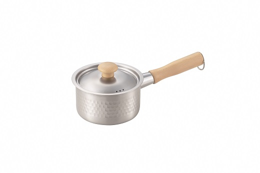 新潟県燕市の職人がお届けする直径14cmの片手鍋です。鍋は熱伝導に優れた軟鉄を耐久性のある18-10ステンレスで挟んだ三層鋼材を使用しています。天然木で安定感のある持ちやすいハンドルで、ガス火・IHクッキングヒーターで使用可能です。手造り感のある槌目仕上げです。