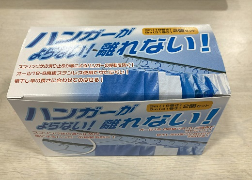 | 容量 | ■ハンガーがよらない!離れない! ※直径4㎝以内の物干し竿に使用可能 材質:スプリング/18-8ステンレス、滑り止めゴム/シリコンゴム ・3m(18巻)・・・83g 適正引き延ばし長さ:1m ・5m(31巻)・・・127g 適正引き延ばし長さ:2m |