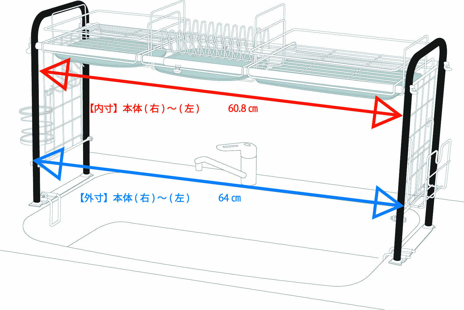 洗い終わった後の食器の保管場所をシンク上の空いたスペースを有効活用しすることにより、洗い物をするときの動作もスムーズに行えます。さらに今まで食器かごをおいていたスペースがフリーになることで、調理時の作業スペースの拡大や食材置き場の確保など良いことだらけ。小さめのコンパクトキッチンにも、大き目キッチンにもどちらにもおすすめ。付属品として大・小の水切りバスケット、皿立て付きなので食器・箸・まな板まで一気に収納できます。また、箸立ての底部分には抗菌効果のある銅を使用し抗菌対策を。お玉やヘラなどを掛けるのに便利なS字フックもついており、至れり尽くせりです。