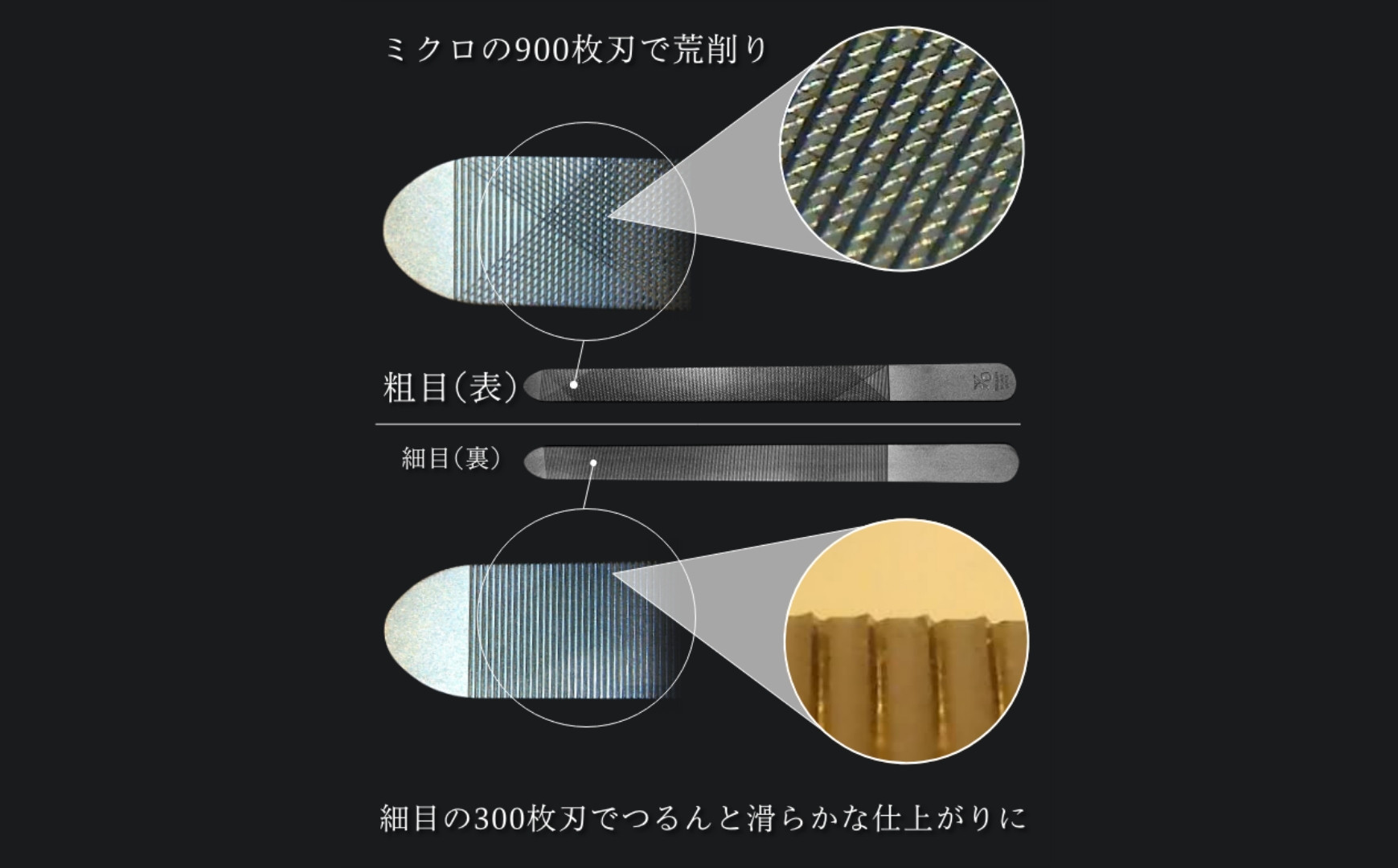 一般的にステンレス製爪ヤスリはヤスリ目が粗いといったイメージがありますが、 YOSHIDA YASURI は金属加工の町、新潟県燕市の熟練の職人が 1 本 1 本手作業でヤスリ目を 打ち込み仕上げるため、ヤスリ目は細かく、削り心地も滑らかです。