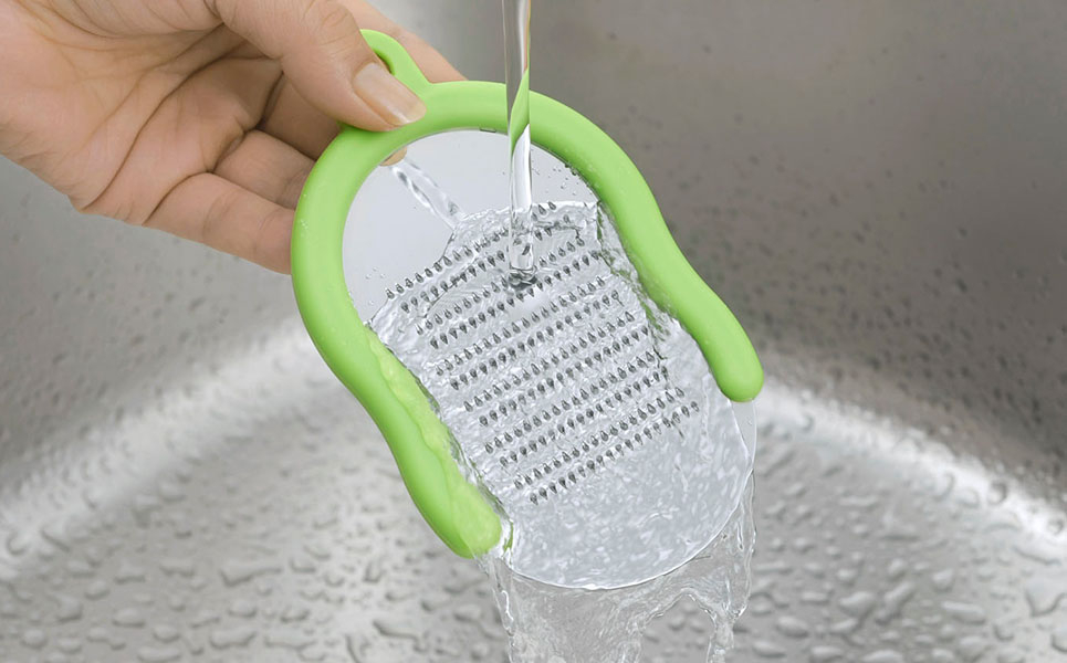 おろし金を湾曲させ、食材の接地面を少なくすることで力をかけずに、楽におろすことができるおろし器に手のひらサイズの薬味おろし器をセットしました。