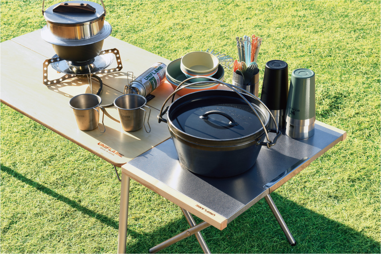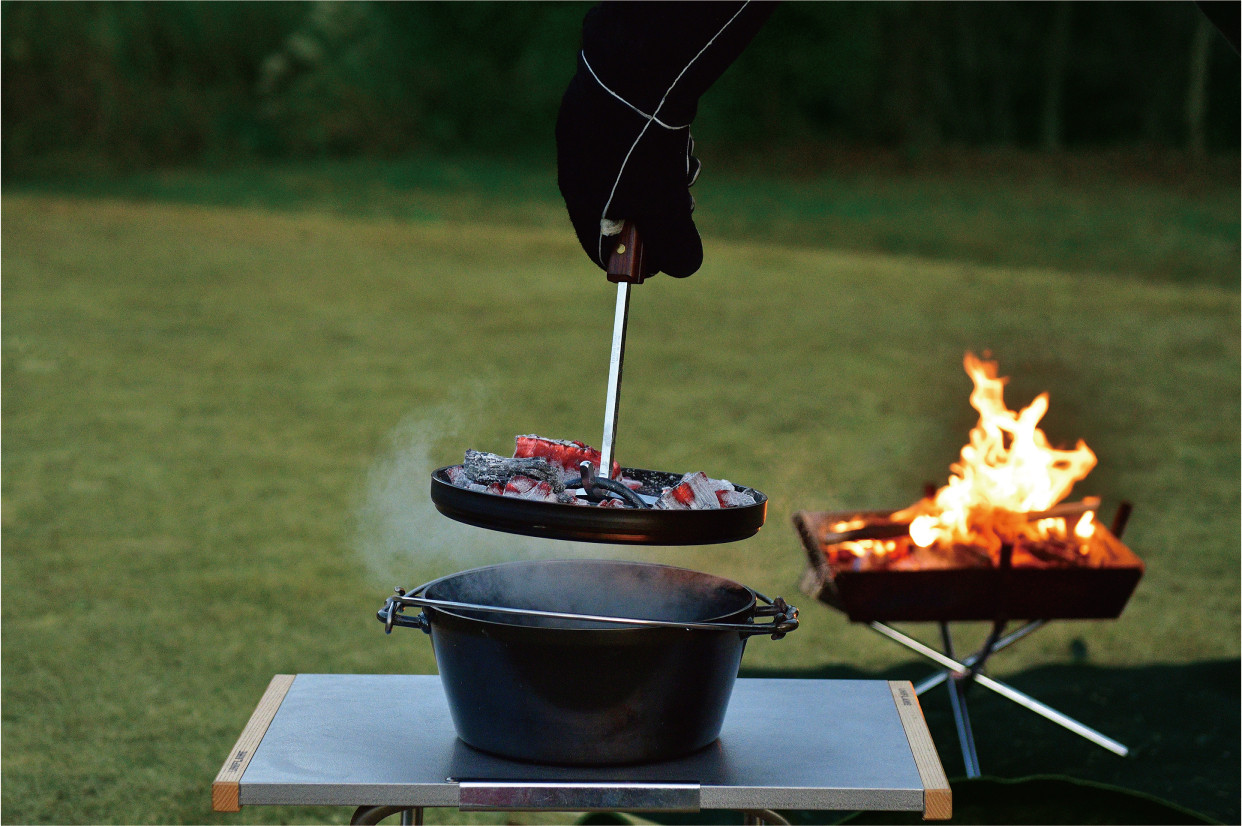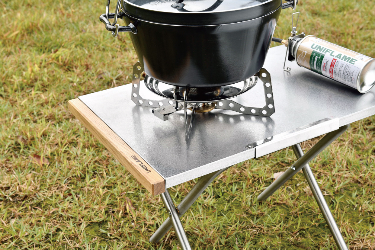 焚き火を囲んだり、ダッチオーブンを楽しむ時に大活躍するローテーブル。特殊エンボス加工を施した18-8ステンレス製のテーブルトップは「熱にも、キズや汚れにも強く」ダッチオーブンをじかに乗せたり、調理台として活躍したりと今までにない高い機能性を実現しています。