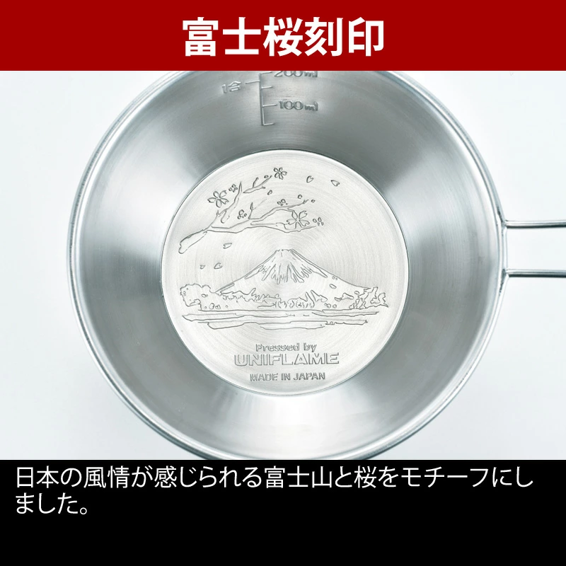 日本の風情が感じられる富士山と桜がモチーフの和風デザインシェラカップ3個セット。スタッキングや目盛など基本性能は踏襲されており使いやすいシェラカップです。