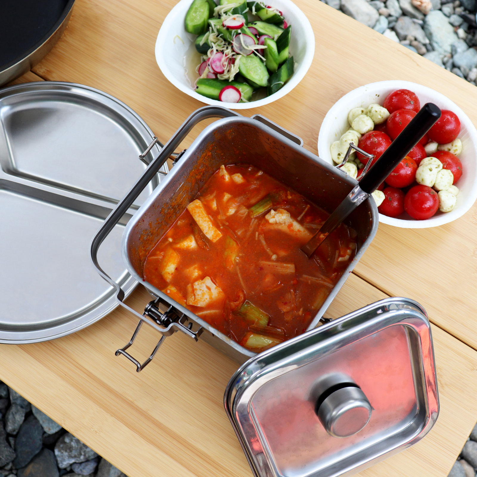 料理の冷蔵庫保存、温め、持ち運びまでを実現するオールインワンキッチン用品、それが給食缶ミニ。こちらは角型タイプの給食缶ミニです。