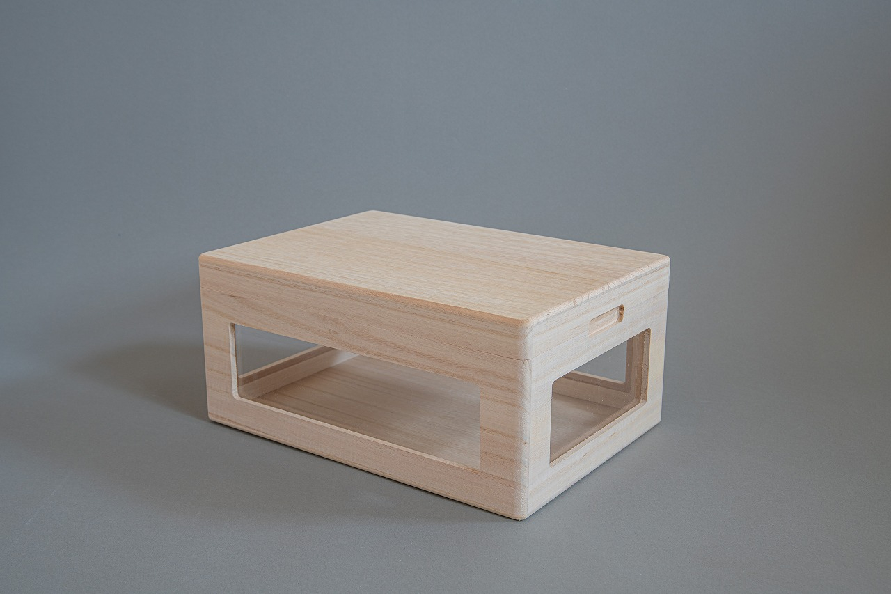 | 容量 | アイテムサイズ:Lサイズ ショート 構造:インロウ式 材質:桐材・透明アクリル板 仕上げ:角イモ組み・サンダー仕上げ 寸法(外寸):約346×246×H158ミリ 重量:約0.8Kg 食器洗浄機:非対応 |