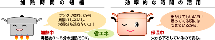 ニューグッドベンリーは内鍋と外鍋の組み合わせによる余熱調理鍋です。調理加熱した内鍋を外鍋に重ねた後、その隙間の空気層が保温状態にされた内鍋の熱を逃がさないように断熱効果の役目を果たします。余熱を利用することで、ゆっくりと温度が下がっていくため、加熱し過ぎによる焦げ付き、煮崩れ、栄養分の破壊を防ぐことが出来ます。じっくり煮込むことで食材の旨味を引き出してくれます。余熱による調理の為、加熱時間の短縮、余熱中は効率的な時間の活用が出来るエコな鍋です。また、外鍋にお湯を入れると湯煎鍋にもなります。もちろん外鍋も内鍋も普通の鍋として使えます。二つの鍋で便利にお料理上手。