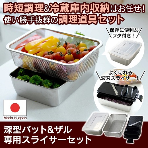 ウェーブ状のスライス刃は、切る時の抵抗も少なく気持ちいいほどの切れ味。金物の街、新潟県燕市で一枚一枚丁寧に仕上げた安心品質の日本製です。キャベツの千切り、玉ねぎ・人参・キュウリ・ジャガイモ・カボチャ・トマトなど色々な食材がスパっとスライスできます。スライスした野菜はそのままバットの中に。バットの中で下ごしらえしたり、ザルを一緒にセットして水を入れておけば、水さらしや水切りなどにもお使いいただけます。