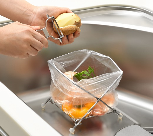 スーパーなどのポリ袋をかけて、調理中のゴミを大きな口にそのままポイッ!使わない時は折りたたんですっきり収納。シンク内に置けば、調理で出た生ゴミを簡単に捨てられます。シンプルな形で、汚れる面積が少なく、ヌルヌルしにくいため洗いやすいです。底板が付いていてゴミを入れた袋が下に付かず、清潔です。折りたためるので、使わない時は片付けられ、シンクが広々使えます。コンパクトなのでアウトドアや洗面台でも使えます。