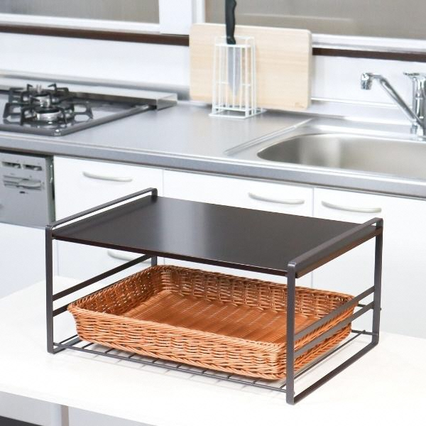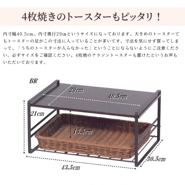 天板は木製でトースターを置いて、下段のバスケットには食パンやジャム、スパイスや常温保存食品などを置けます。