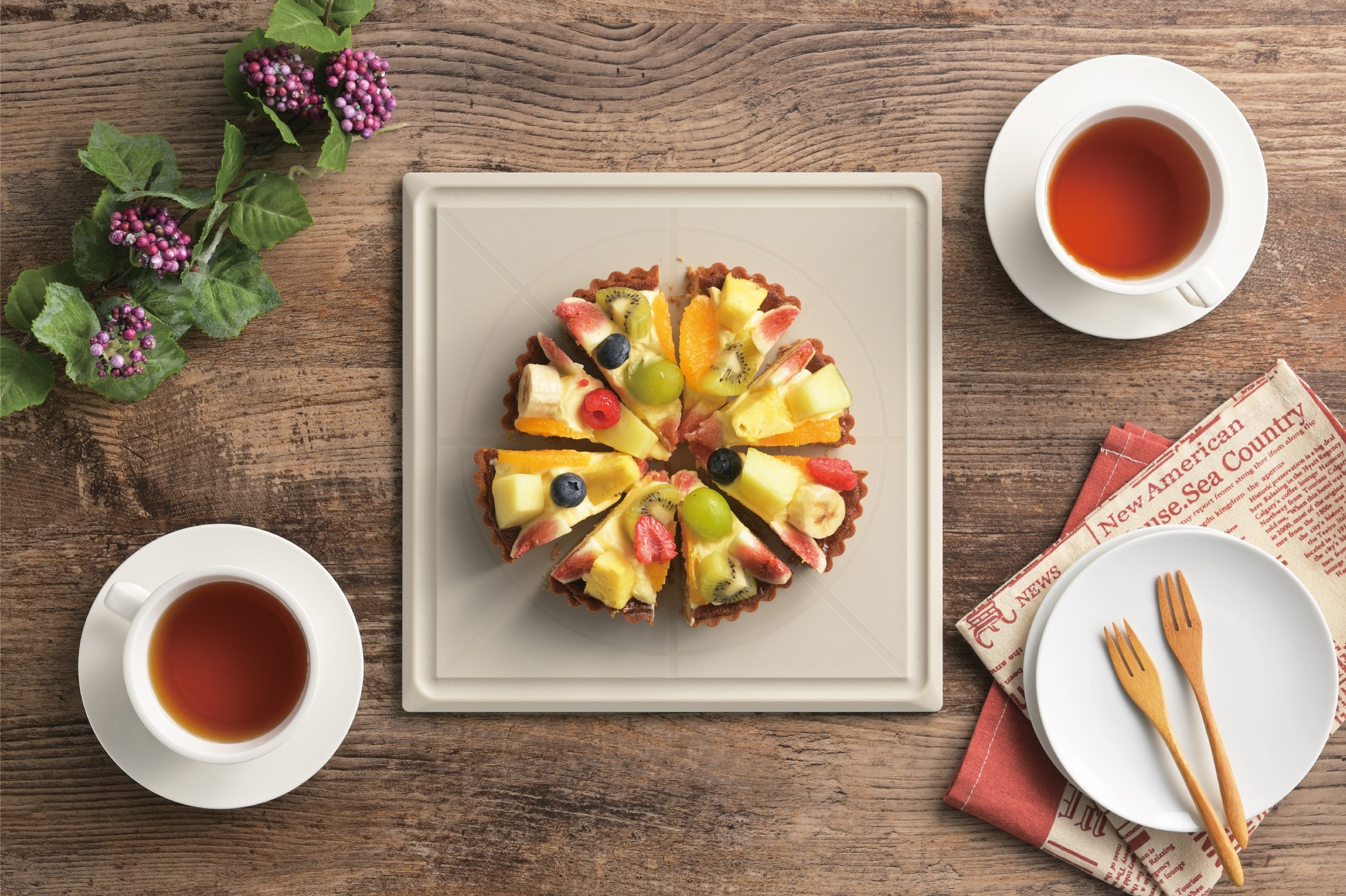 切ってそのまま食卓に。お皿としても使用できるまな板です。サイズ違いの2枚セット品。ピザやケーキを均等にカットできるライン入りです。滑りにくい材質で優しい刃あたり。溝付きだから汁こぼれも安心です。用途に合わせて両面で使い分けできます。