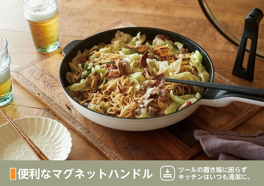 3~4人の家族にぴったりの、直径28㎝ワイドサイズ。焼き物や炒め物に強く、大人数向けの食材も、手早く、ムラなく調理。