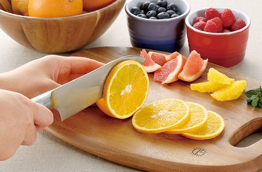キッチンナイフの刀身は芯材にモリブデンバナジウムを添加した特殊ステンレス鋼を使用し、粘り強い13クロームステンレスで挟み込んだ3層鋼です。切れ味・折れにくさ・さびにくさを併せ持ちます。