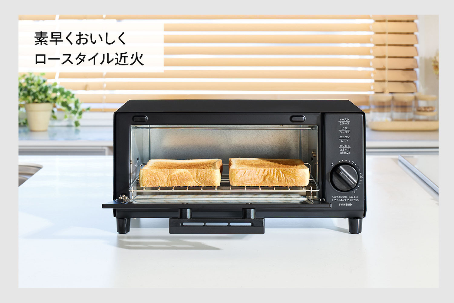 時間を設定するだけのかんたん操作で、朝食のトーストをさっと焼きたい時など手軽に使いたいシーンでも、近火ヒーターで素早く美味しく焼き上げます。