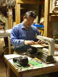 チェーンソーを担いで山に入り、木を伐り、丸太にして工房にて3,4年寝かせます。丸太を斧で割り、製材して厚みを合わせて板にします。