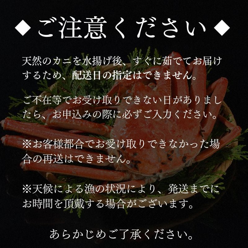 ※天然のカニを水揚げ後、すぐに茹でてお送りするため、配送日の指定はできません。