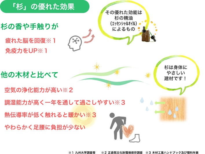 杉の調湿機能がインフルエンザの発症を抑制するほか空気の浄化機能や油分豊富な香りが安眠効果をもたらします。