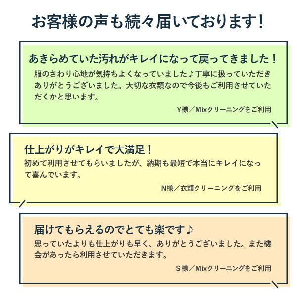 ・有料のオプションサービス(破れ修理、撥水加工、抗菌加工、W洗い等)をご希望される場合は、クリーニングキットに同封する依頼書に必要事項をご記入ください。
