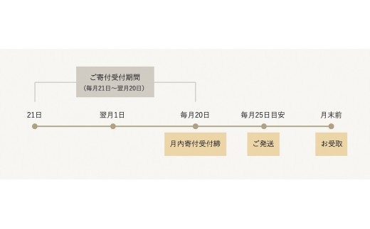 21日~翌月20日のご寄附で、翌月末までにお届けいたします。 (例:8/21~9/20のご寄附で、9月末までのお届け) |