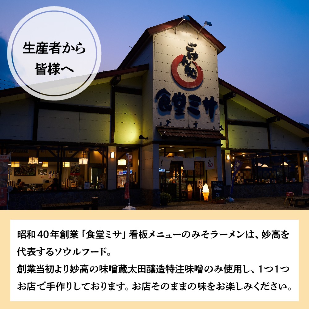 上越妙高味噌ラーメンの生みの親、ミサ系味噌ラーメンの元祖 新潟上越妙高 ごはん処 食堂ミサ 看板のみそラーメンは 新潟県内で不動の地位を確立!! 創業当時から変わらぬ特注味噌を使用し、たっぷりのたまねぎ から出る甘味にパンチの効いたにんにくがアクセント! 長年、地域に愛されたオリジナリティ溢れる逸品です! パンチの効いた味噌!