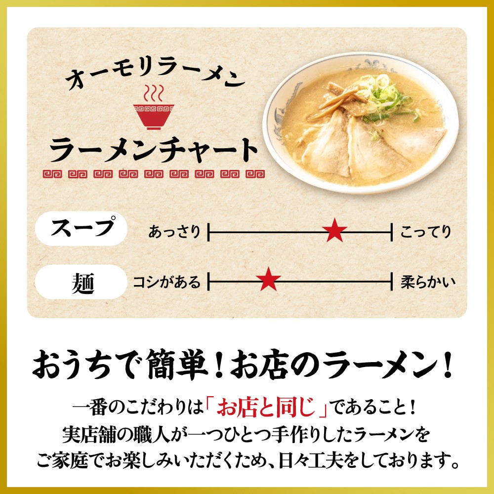 新潟県上越妙高地域で半世紀以上慣れ親しまれているオーモリラーメンは、16時間以上をかけて炊いた豚骨の甘く香ばしいスープと、小麦の風味をしっかり楽しめる中太ちぢれの自社製麺が特徴です。