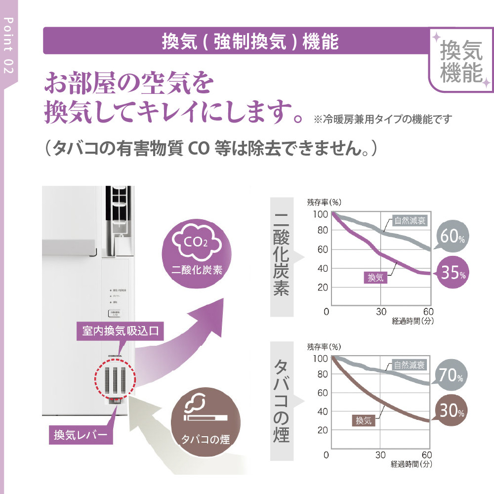 ・換気(強制排気)機能付きで、冷暖房しながらお部屋の換気が出来る。