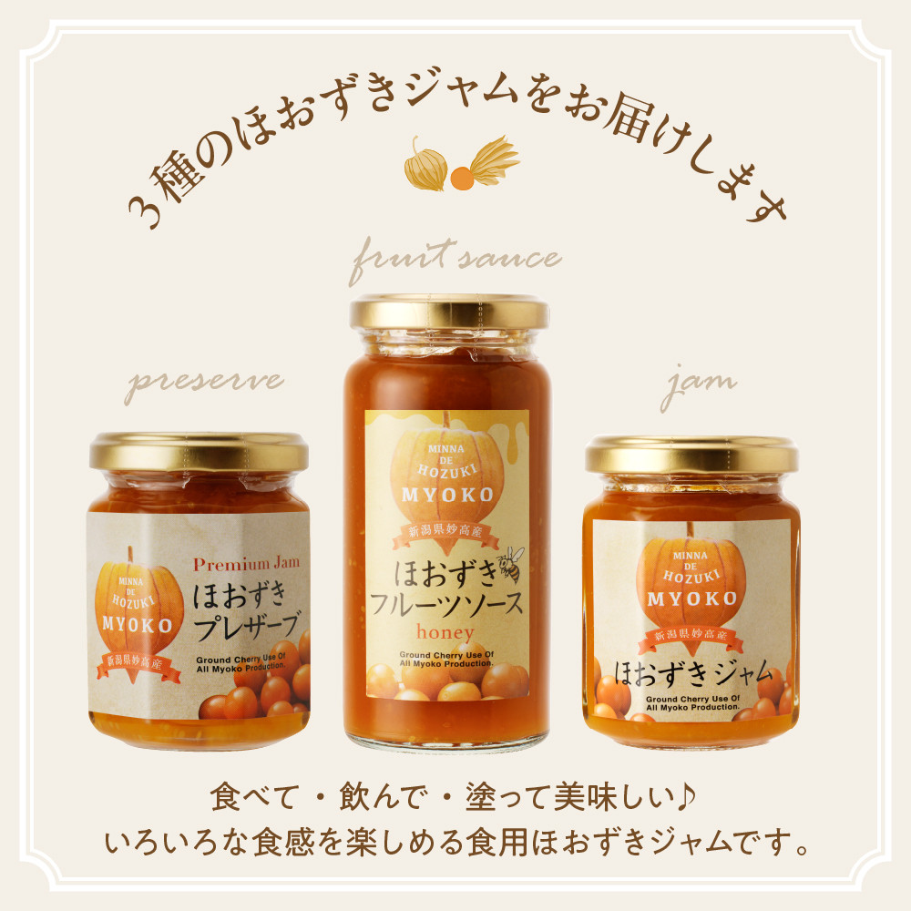 食べる、飲める、塗るジャム! いろいろな食感で楽しめます 妙高フルーツほおずきのジャム3種セット