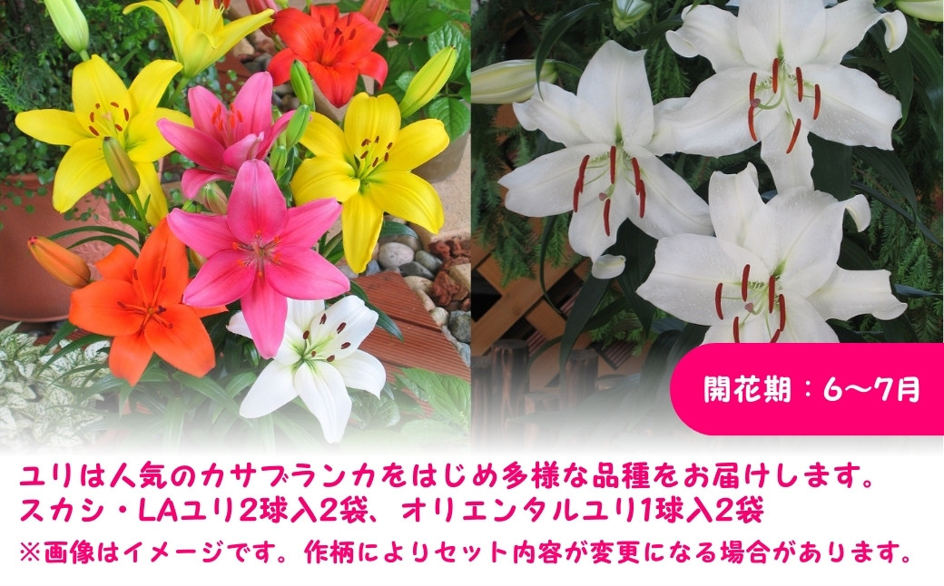 ユリは人気のカサブランカをはじめ多様な品種をお届けします。(開花期:6~7月)