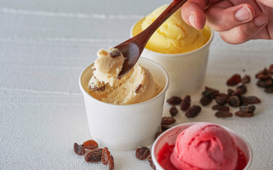 「私の一押しはラムレーズンです。バニラアイスに芳醇なラム酒漬けレーズンをバランス良く混ぜ込んでいます。ちょっぴり大人の味なんですよ」
