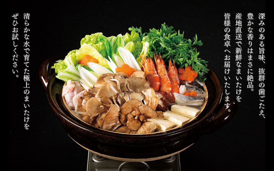 五泉市の自然の恵みをたっぷりと受け、手間と時間を惜しまず育てられた「雪国まいたけ極」を是非お楽しみください。