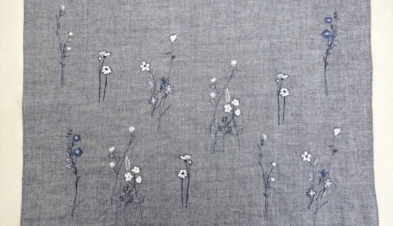 オーガニックコットンを使用した綿麻スラブ生地に可憐な小花を刺繍したストールです。素朴で可愛らしい野花をモチーフに、生地のカラーに合わせ刺繍糸の色を選び、イエローには色とりどりの花を、デニムにはモノトーンの花を咲かせました。一つ一つの柄に存在感を与えつつ、着用時に首周りには当たらず顔周りに柄が映えるようなレイアウトにもこだわっています。