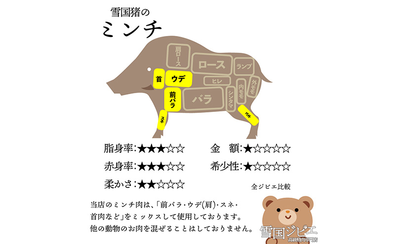 ※ 雪国イノシシは「ミンチ(ひき肉)」の他に、「ロース・肩ロース・ランプ・バラ・外モモ・内モモ・シンタマ」のお礼品登録もございます。